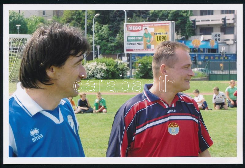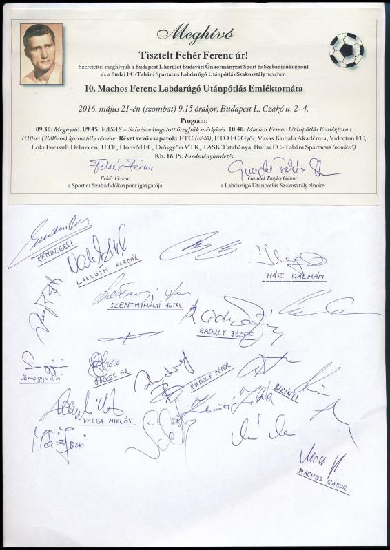 2016 Bp., 10. Machos Ferenc Labdarúgó Utánpótlás Emléktorna emléklapja, rajta résztvevők aláírásaival: Gundel Takács Gábor, Laklóth Aladár, Ihász Kálmán, Rudolf Péter, Szentmihályi Antal, Raduly József, stb. (össz. 22 db aláírás) + Illés Béla labdarúgót ábrázoló fotó, 15x10 cm