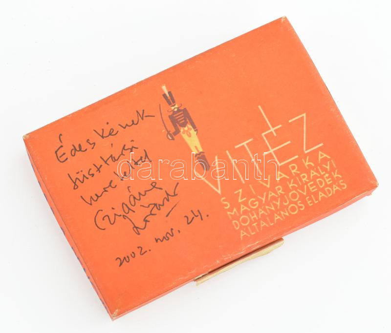 Leírás: Czigány Lóránt (1935-2008) író dedikációja Haraszty István "Édeskének" (1934-2022), Kossuth-díjas szobrász és festőművésznek, Vitéz Szivarka kartondobozon.