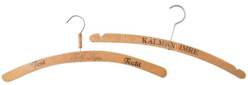 Leírás: 2 db vállfa, Kálmán Imre és Tóth Lajos reklámfeliratokkal, kopással