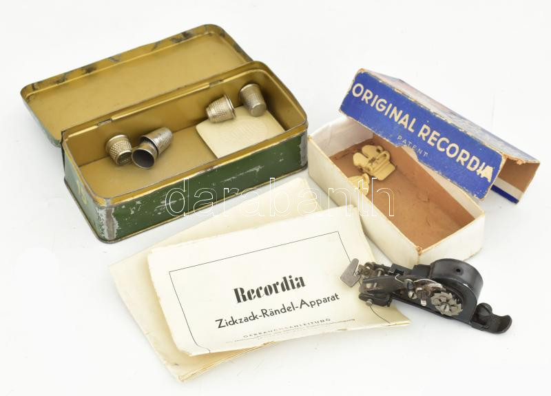 Leírás: Recordia cikk-cakk varó eredeti dobozában használati utasítással + Singer fém doboz gyűszűkkel