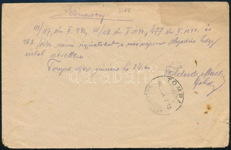 1940 "M. kir. szegedi V. honvéd hadtest kémelhárító osztály" bélyegzéssel ellátott boríték, a tompai gyűjtőtábor (hadifogolytábor) parancsnokságának címezve, hátoldalán Földesdy főhadnagy feljegyzésével