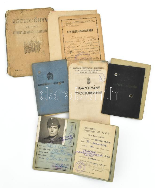 cca 1940 -50 Vegyes katonai igazolvány tétel: zsoldkönyv, levente igaz... https://www.darabanth.com/hu/454-Gyorsarveres/454.0/Mutargy-papirregiseg-egyeb/Militaria~1500008/cca-1940-50-Vegyes-katonai-igazolvany-tetel-zsoldkonyv-levente-igazolvany-katonai-jogsi-kat~II3029537