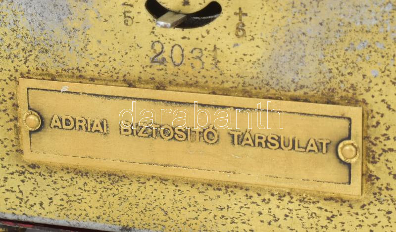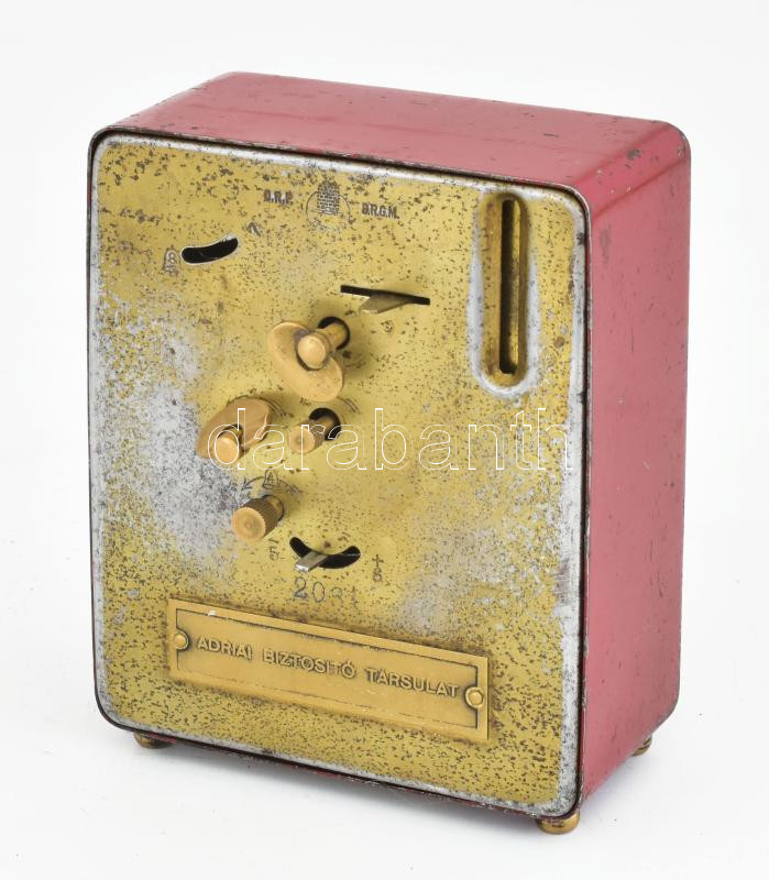 Leírás: Adria biztosító társaság persely és óra egyben. Fém, jelzett, kopott, működik 12x10 cm