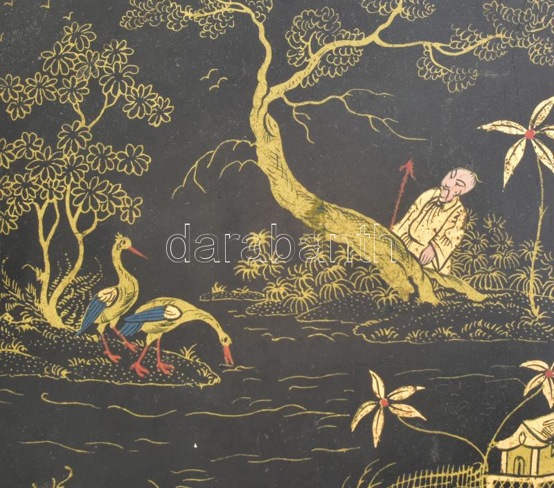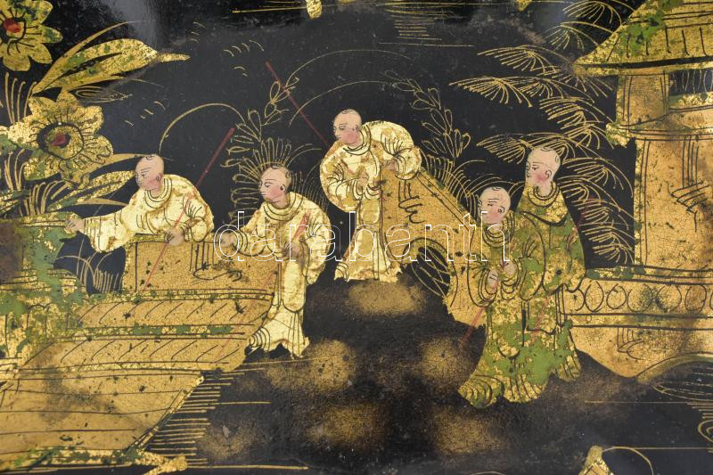 Leírás: Antik japán dísztál és morzsakefe szett. Festett fém, bronz és fa, kefén kis hiánnyal. Kopással. Kefe, tál, lapát.