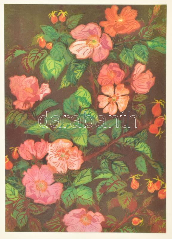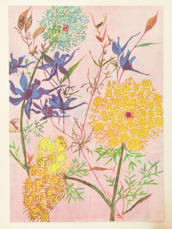 Leírás: 12 db virágokat ábrázoló, színes nyomat, lapokra kasírozva, helyenként foltos lapszélekkel, 27x19 cm