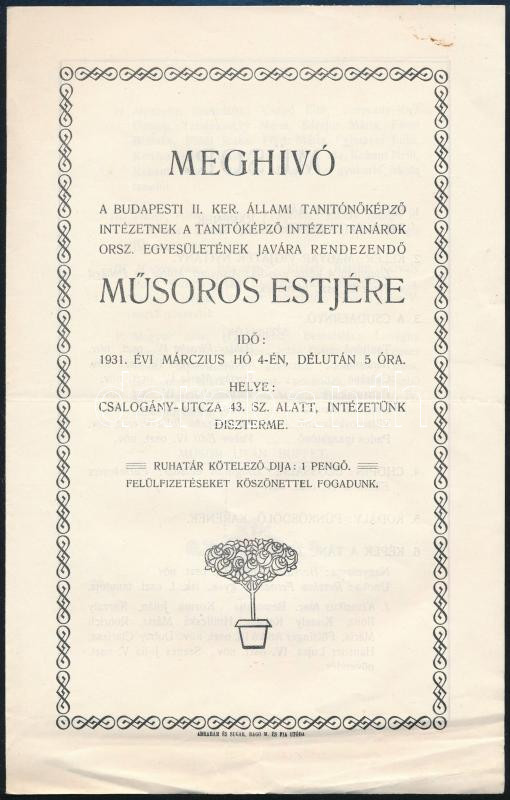 1931 Meghívó a budapesti II. ker. állami tanítónőképző intézet műsoros... https://www.darabanth.com/hu/454-Gyorsarveres/454.0/Mutargy-papirregiseg-egyeb/Nyomtatvanyok~1500012/1931-Meghivo-a-budapesti-II-ker-allami-tanitonokepzo-intezet-musoros-estjere-Bp-Abr~II3025233