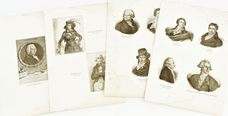 Leírás: A francia forradalom jelentős alakjai, 4 db kétoldalas nyomat, ázott, foltos állapotban, 32,5x22,5 cm