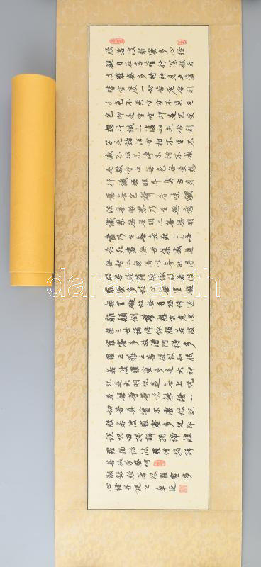 Leírás: Kínai papírkép tekercs, cca 105x28 cm, díszhengerben