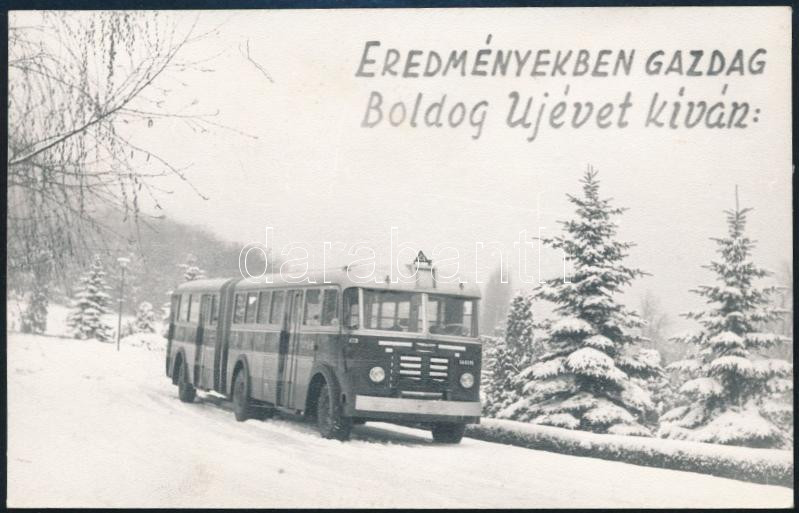 Leírás: cca 1960-1980 MÁVAUT autóbuszt ábrázoló újévi üdvözlőlap, hátoldalán aláírással, 14x9 cm