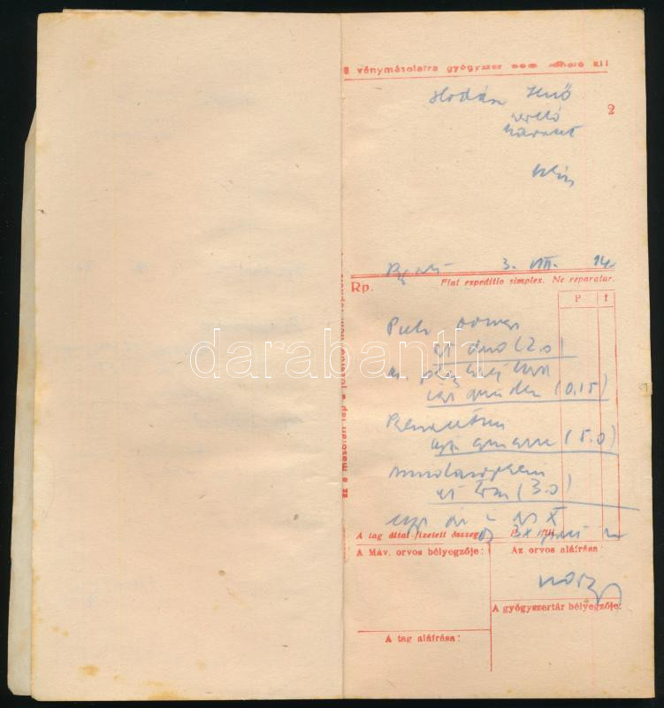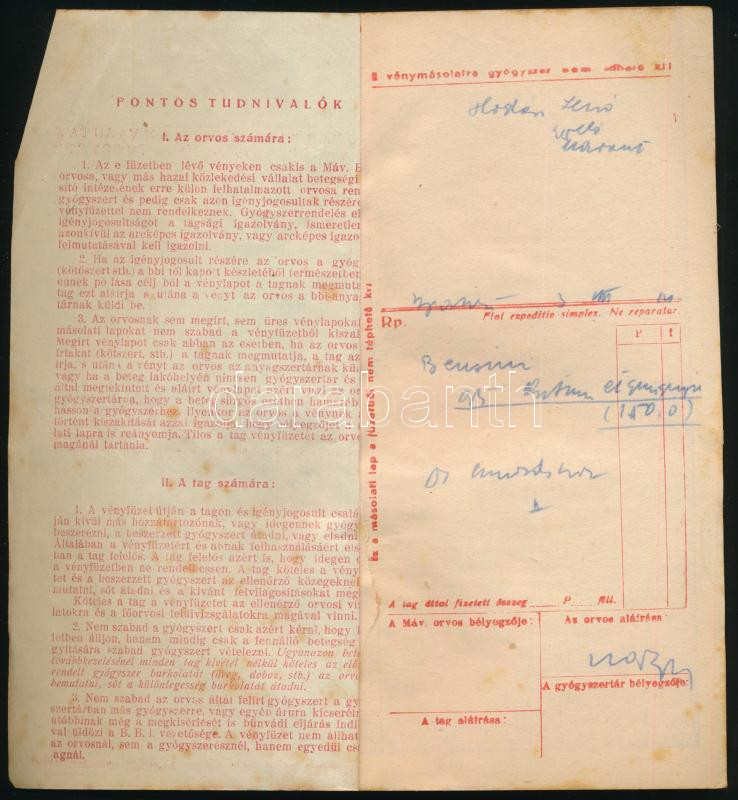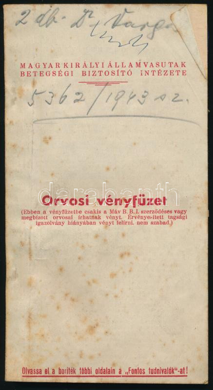 1943 M. Kir. Államvasutak Betegségi Biztosító Intézete, Orvosi vényfüz... https://www.darabanth.com/hu/454-Gyorsarveres/454.0/Mutargy-papirregiseg-egyeb/Okmanyok~500020/1943-M-Kir-Allamvasutak-Betegsegi-Biztosito-Intezete-Orvosi-venyfuzet-bejegyzesekkel-ki~II2959008