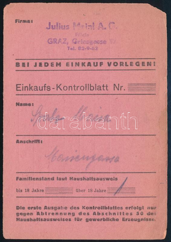 cca 1944 Graz, Julius Meinl bevásárlási könyvecske https://www.darabanth.com/hu/454-Gyorsarveres/454.0/Mutargy-papirregiseg-egyeb/Okmanyok~500020/cca-1944-Graz-Julius-Meinl-bevasarlasi-konyvecske~II3025129