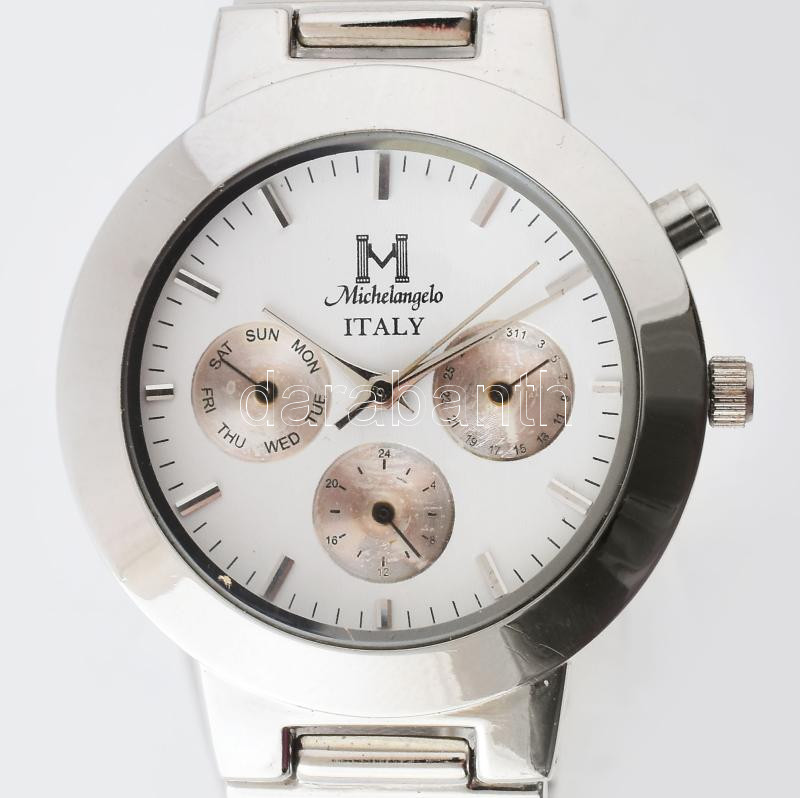 Michelangelo Italy kvarc karóra, működő, jó állapotban, fém szíjjal 38... https://www.darabanth.com/hu/454-Gyorsarveres/454.0/Mutargy-papirregiseg-egyeb/Orak~500011/Michelangelo-Italy-kvarc-karora-mukodo-jo-allapotban-fem-szijjal-38-mm~II3011218