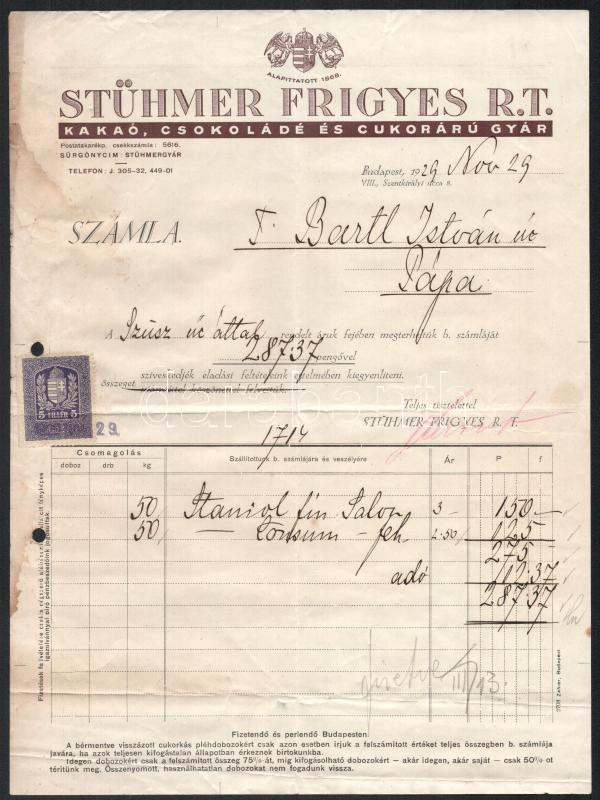 1929 Stühmer Frigyes R.T. Kakaó, Csokoládé és Cukorárugyár - fejléces ... https://www.darabanth.com/hu/454-Gyorsarveres/454.0/Mutargy-papirregiseg-egyeb/Reklam~2000024/1929-Stuhmer-Frigyes-RT-Kakao-Csokolade-es-Cukorarugyar-fejleces-szamla~II3030318
