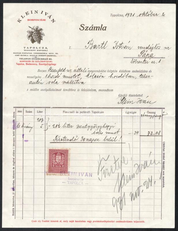 Leírás: 1931 Tapolca, Klein Iván Borpincéje: Tapolca, Badacsony, Szentgyörgyhegy fejléces számla