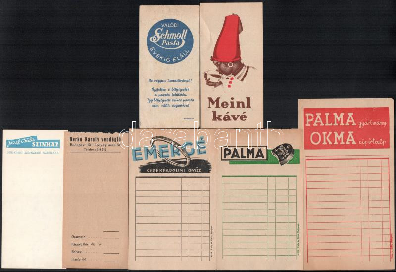 7 db vegyes számolócédula (Meinl, Palma, József Attila Színház, stb.) https://www.darabanth.com/hu/454-Gyorsarveres/454.0/Mutargy-papirregiseg-egyeb/Reklam~2000024/7-db-vegyes-szamolocedula-Meinl-Palma-Jozsef-Attila-Szinhaz-stb~II3027172