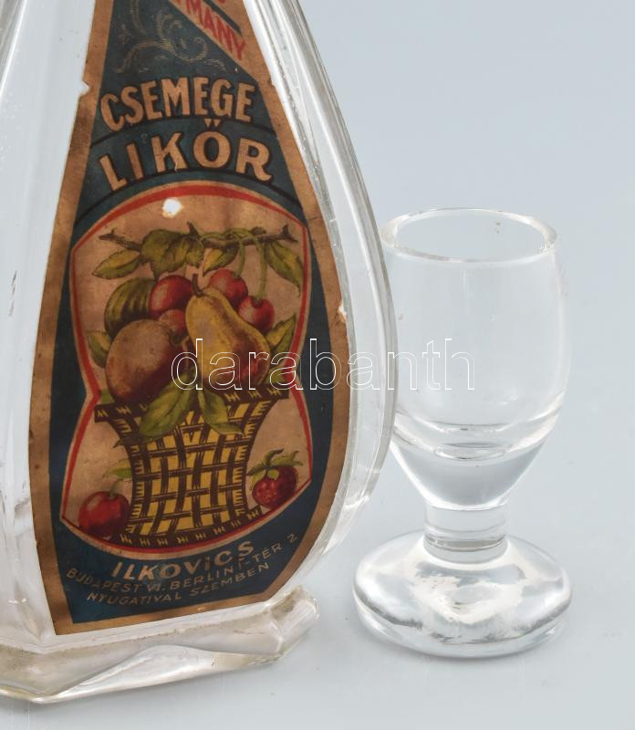 Leírás: Csemege likőr üveg, Ilkovics Vendéglő reklámjával + üvegpohár, Ilkovics Buffet gravírozással, kopott címkével, kopással, m: 7,5, 28 cm