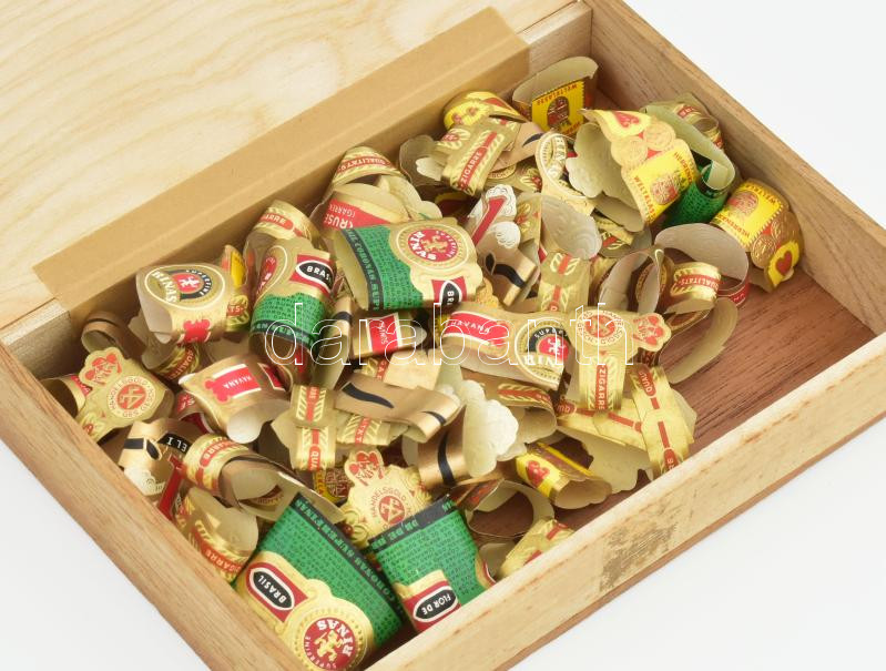 Leírás: Régi szivargyűrű gyűjtemény, kubai szivaros dobozban, de a dobozon címke nélkül, 17x12x3 cm