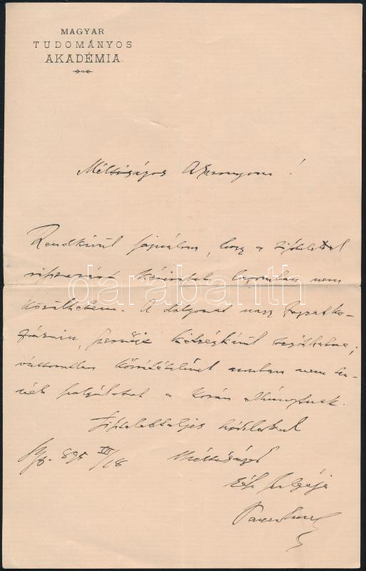 Pauer Imre (1845-1930) premontrei szerzetes, filozófus, pedagógus, az Athenaeum szerkesztőjének saját kézzel írt levele az MTA fejléces levélpapírján, hajtott, szakadással, 1 beírt oldal.