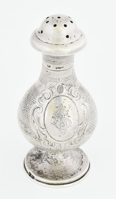 Leírás: Ezüst (Ag) sószóró, jelzett, m: 13,5 cm, kopással, nettó: 103,5 g