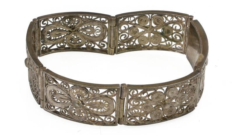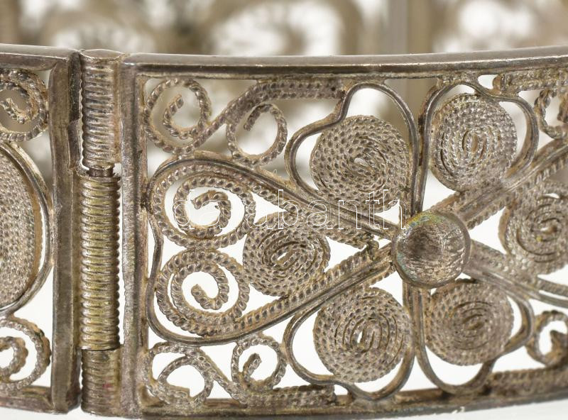 Leírás: Ezüst(Ag) filigrán díszítésű karperec, jelzett, d: 5,5 cm, nettó: 29,1 g