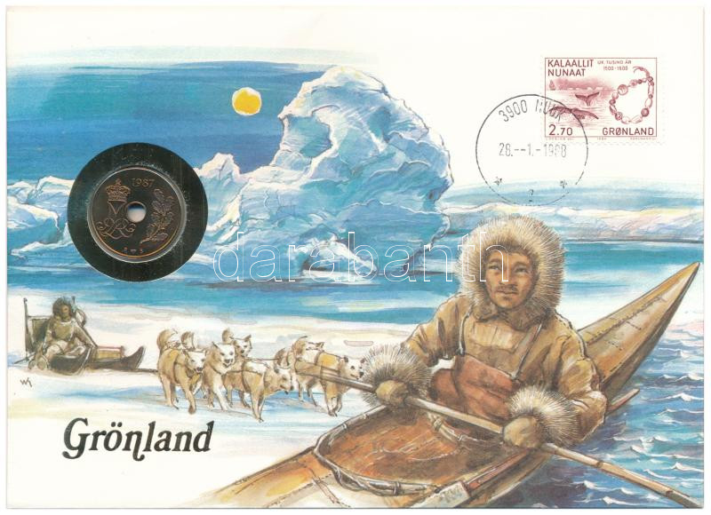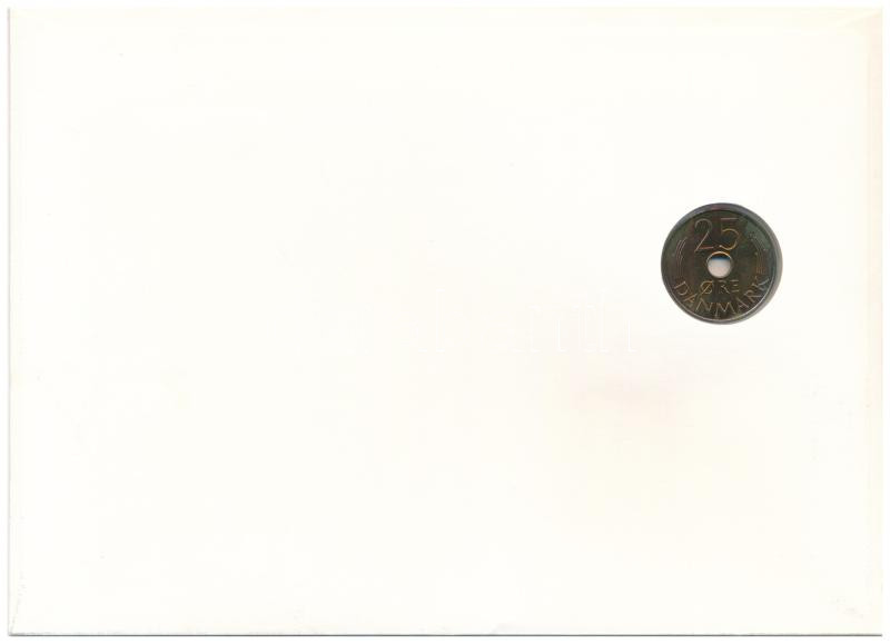 Grönland, benne Dánia 1987. 25ö felbélyegzett borítékban, bélyegzéssel, német nyelvű leírással T:UNC Greenland with Denmark 1987. 25 Öre coin in envelope with stamp and cancellation, with German description C:UNC