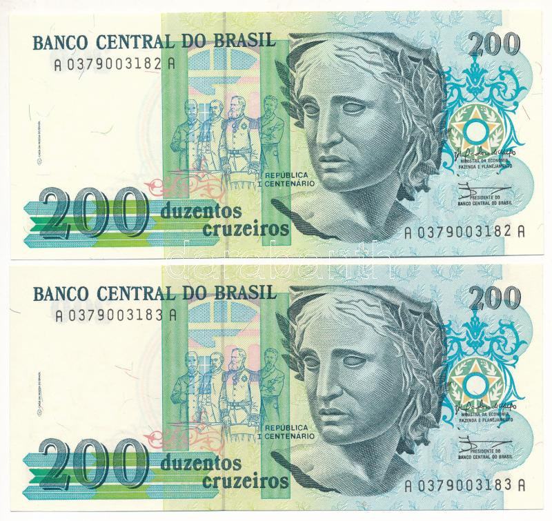 Brazil 1990. 200 Cruzeiros (2x) consecutive serials "A 0379003182 A - A 0379003183 A" C:UNC