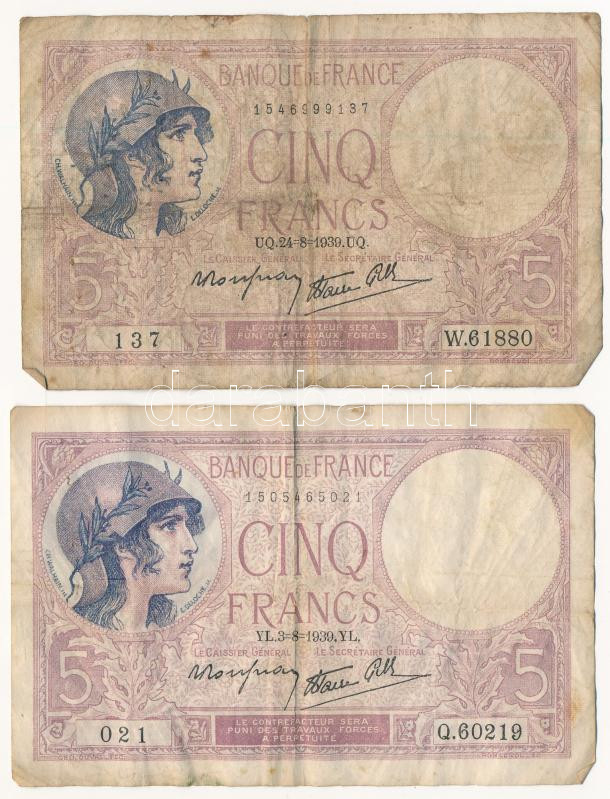 Leírás: Franciaország 1939. 5Fr (2xklf) T:F,VG tűly. France 1939. 5 Francs (2xklf) C:F,VG pinholes