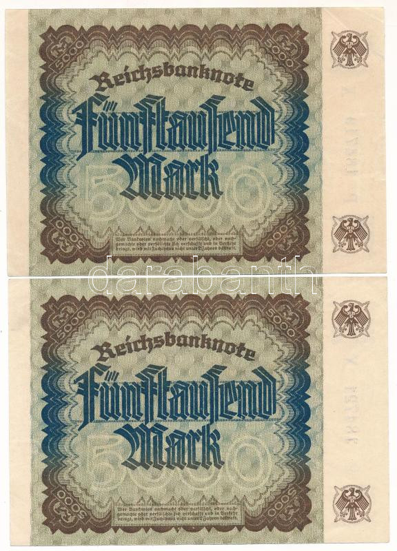 Leírás: Németország / Weimari Köztársaság 1922. 5000M (2db, egyugrásos sorszámkövető) T:XF hajtatlan, sarokhajlások Germany / Weimar Republic 1922. 5000 Mark (2pcs, consecutive serials with one leap) C:XF unfolded, but folded corners Krause P#77