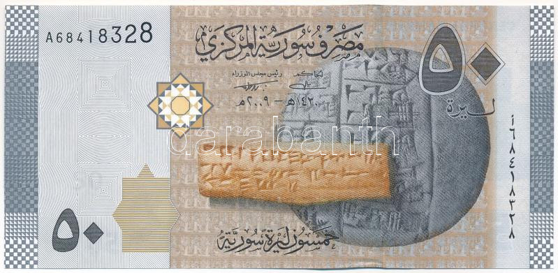 Krause 112. https://www.darabanth.com/hu/454-Gyorsarveres/454.0/Numizmatika/Kulfoldi-bankjegyek~2000014/Sziria-2009-50P-TUNC--Syria-2009-50-Pounds-CUNC--Krause-112~II2974776