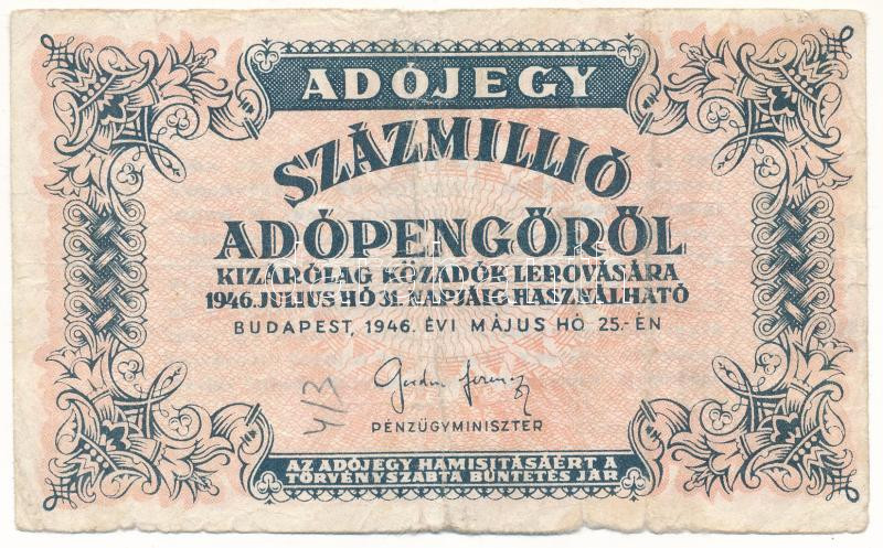 Leírás: 1946. 100.000.000AP T:VG kis szakadások, tű ly.