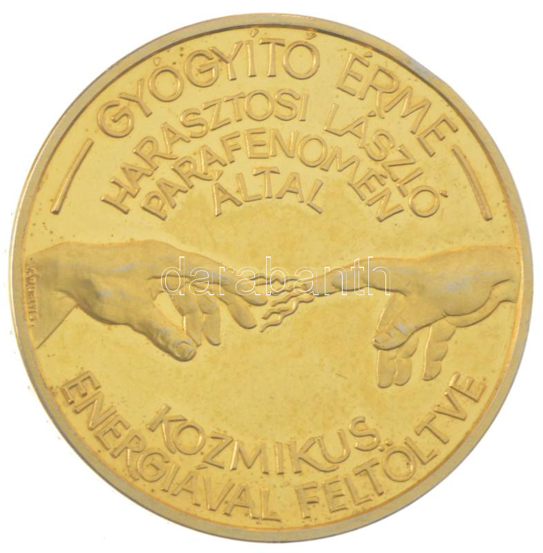 Leírás: DN "Gyógyító érme Harasztosi László parafenomén által kozmikus energiával feltöltve" aranyozott emlékérem. Szign. Várhelyi S. (30,5mm) T:UNC
