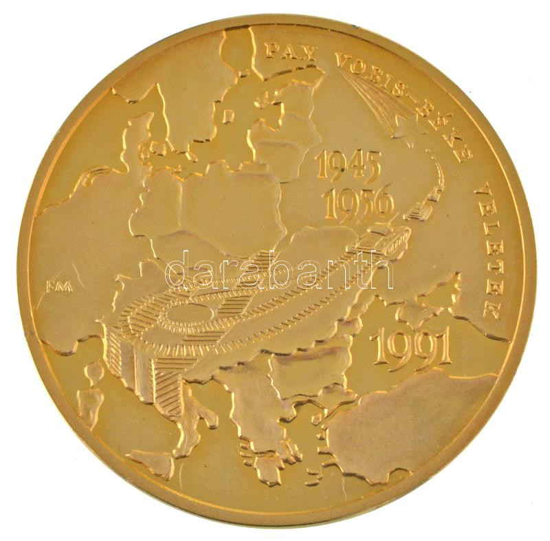 Fritz Mihály (1947-) 1991. "Megszálló szovjet csapatok kivonulása / Pax vobis - Béke veletek / KONYEC" aranyozott bronz emlékérem (42,5mm) T:AU (eredetileg PP) ujjlenyomat, kis ph