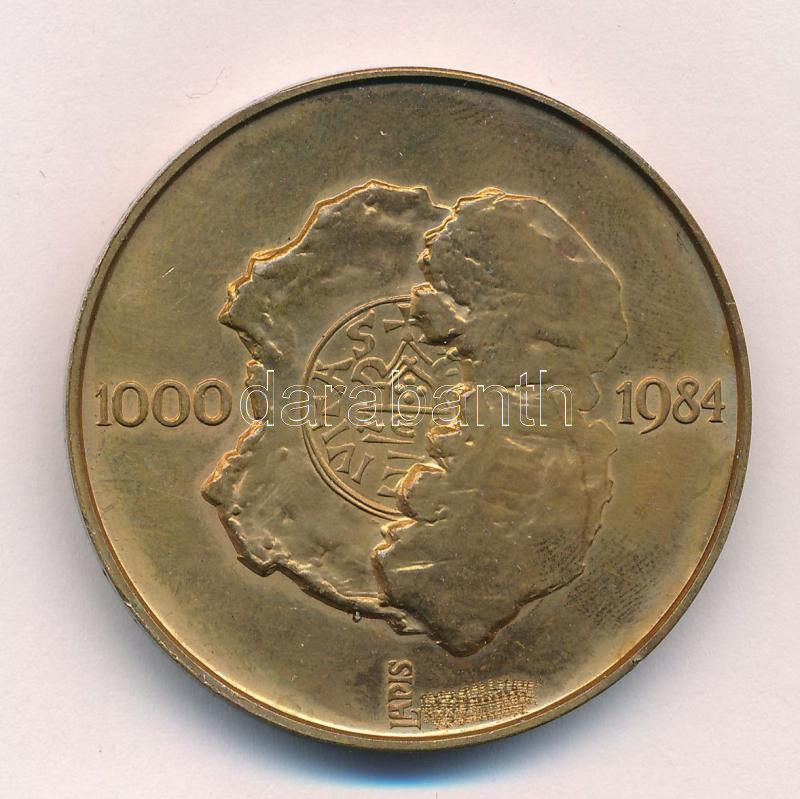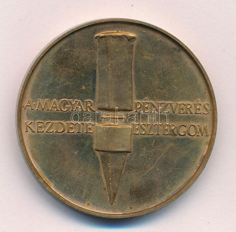 Lapis András (1942-) 1984. "MÉE Esztergom - A magyar pénzverés kezdete" bronz emlékérem, hibás veret: ezüstjelzést tartalmazó verőtővel készült bronz kivitel, a később megvalósult ezüst veretektől eltérő módon ezüstjel a Lapis szignó mellett, utólag olvashatatlanná téve (42,5mm) T:UNC,AU