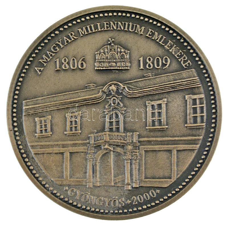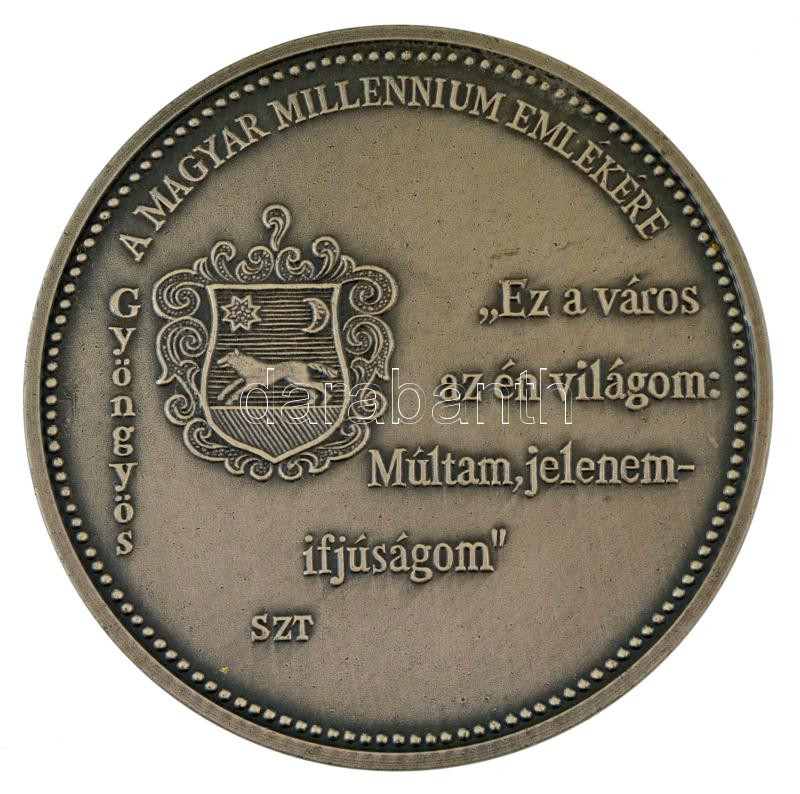 Szabó Tamás (1952-) 2000. "A Magyar Millennium emlékére - Gyöngyös, 2000. / "Ez a város az én világom: múltam, jelenem - ifjúságom" kétoldalas, ezüstpatinázott fém emlékérem sérült tokban (70mm) T:UNC,AU