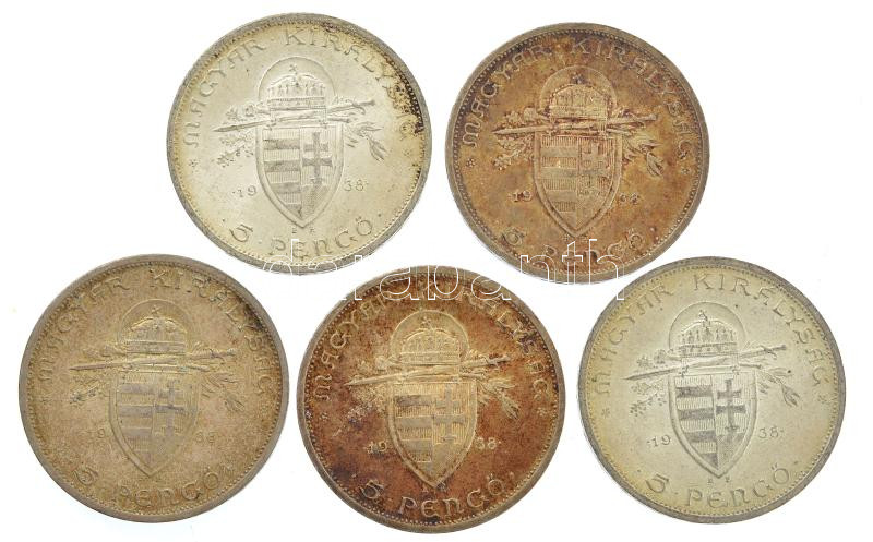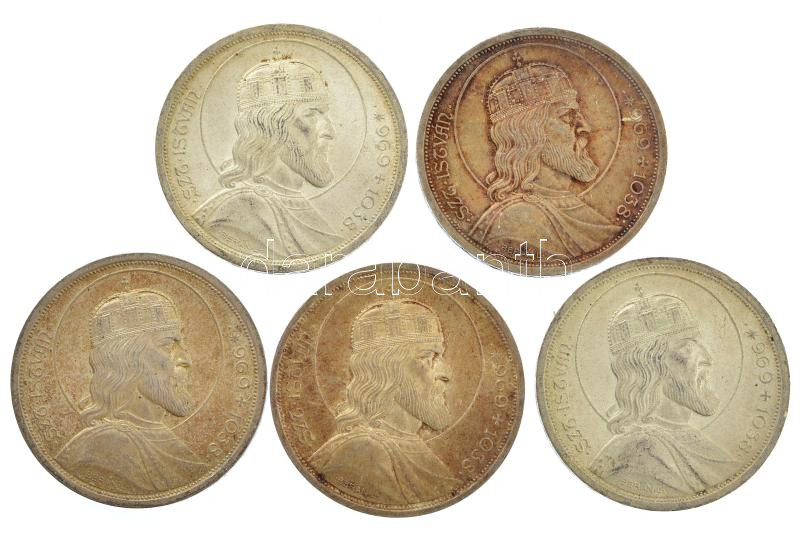 Leírás: 1938. 5P Ag "Szent István" (5x) T:1- patina Adamo P8.1