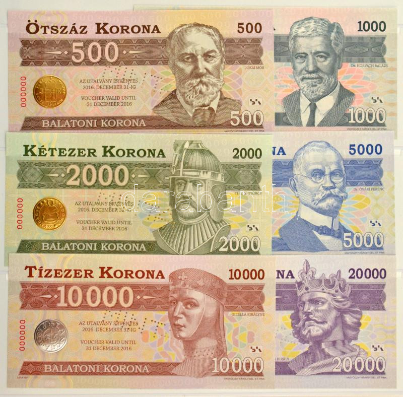Hungary 2012. 500 Balatoni Korona - 20.000 Balatoni Korona (6xdiff) local money, all with "MINTA (specimen)" perforation, with "000000" serial number. Complete series! C:UNC
