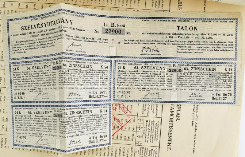 1914. "Budapest Székesfőváros" 4 1/2%-os Kötelezvény bemutat... https://www.darabanth.com/hu/454-Gyorsarveres/454.0/Numizmatika/Reszvenyek-es-sorsjegyek~2000005/1914-Budapest-Szekesfovaros-4-12-os-Kotelezveny-bemutatora-2400K-rol-ket-nyelven-szar~II3031391