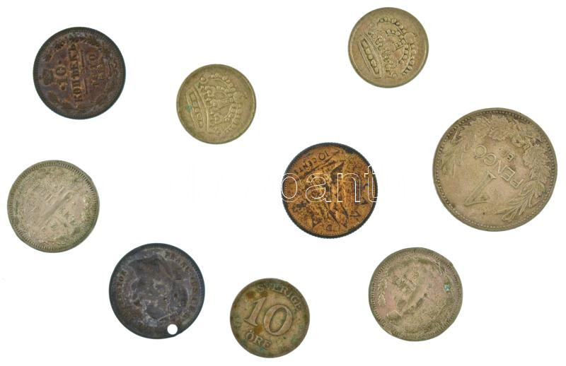 9xklf, gyengébb állapotú ezüst érméből álló tétel, benne 1937. 1P Ag + Ausztria ~1870. 10kr Ag "Ferenc József" az érme hátlapja lecsiszolva és gravírozva (ly.) + Kanada 1962. 10c Ag "II. Erzsébet" + Orosz Birodalom 1906-1914. 10k Ag (3xklf) + Svédország 1928-1957. 10ö Ag (3xklf) T:F,VG patina