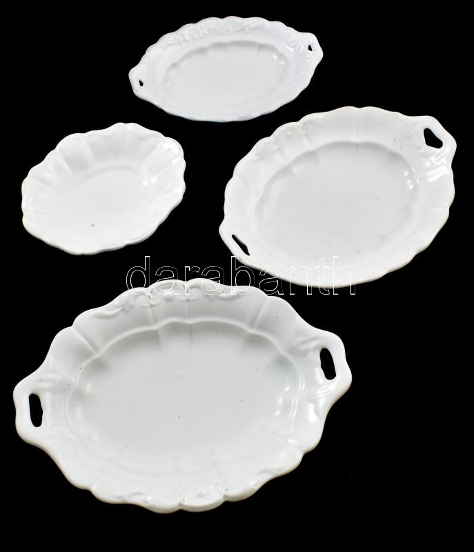 Leírás: 4 darab antik fehér porcelán pecsenyés tál, klf jelzésekkel, domború díszítéssel, közte Zsolnay, közte repedéssel, kopással h: 20-32 cm