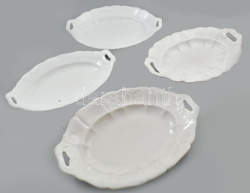 Leírás: 4 darab antik fehér porcelán pecsenyés tál, klf jelzésekkel, domború díszítéssel, közte sérüléssel, kopással h: 39-56 cm