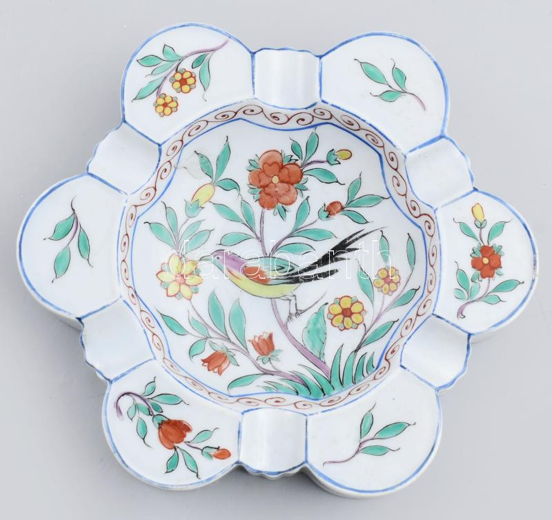 Leírás: Herendi paradicsommadaras porcelán hamutál. Kézzel festett, jelzett, oldalán ragasztott sérüléssel 15 cm