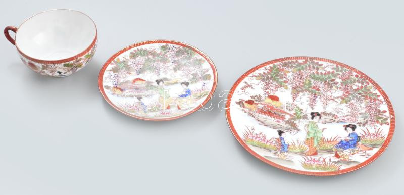 Leírás: Japán, XX. sz, Gésa jelenetekkel vékonyporcelán reggeliző szett. Jelzett, kis kopással, d: 18 cm