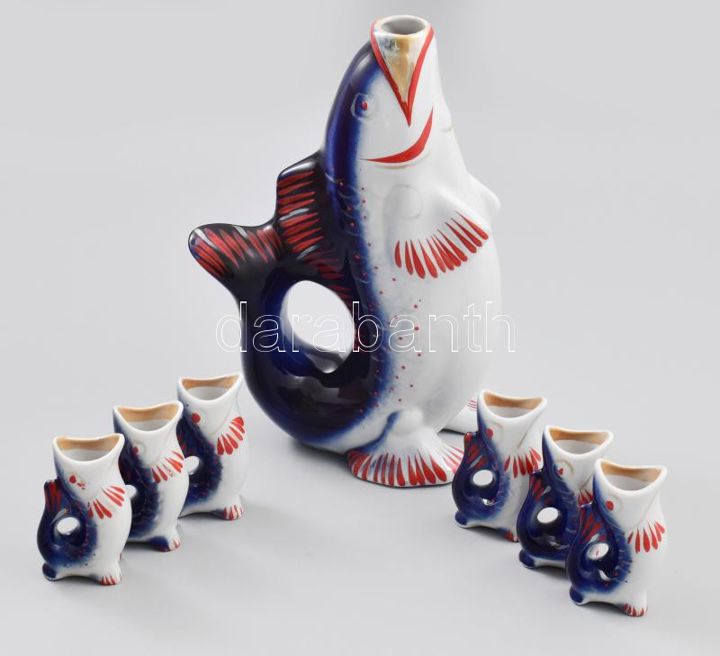 Leírás: Szovjet porcelán halas italos készlet, kiöntő + 6 db kupicás pohár. Kézzel festett, jelzett, kis kopásnyomokkal, m: 7,5 - 24 cm