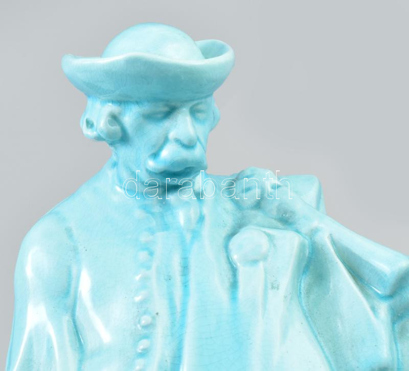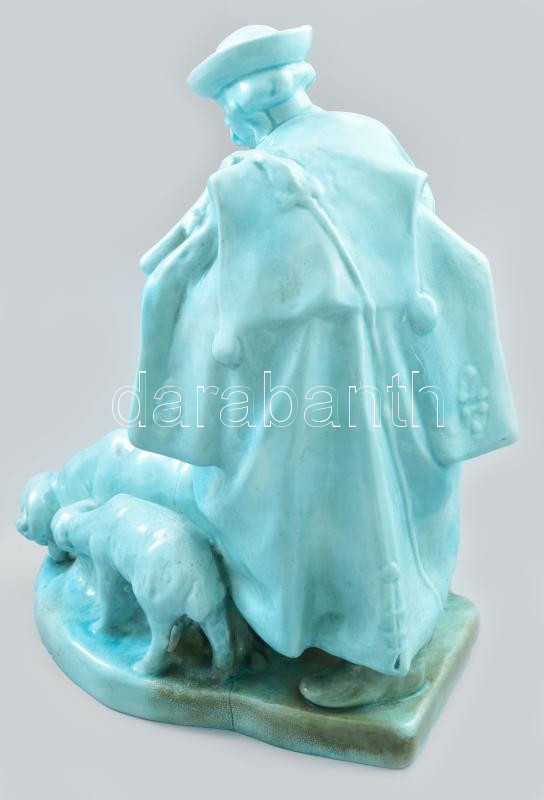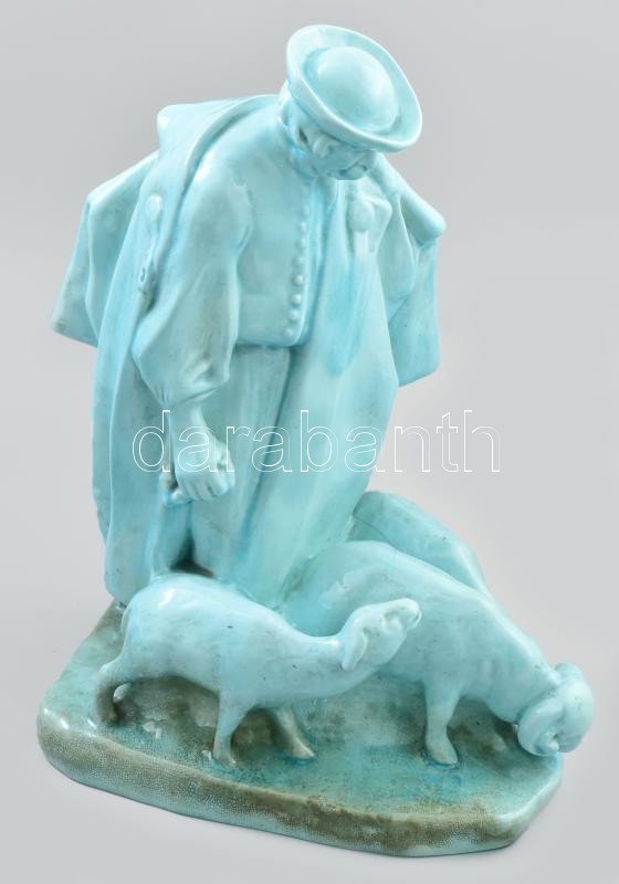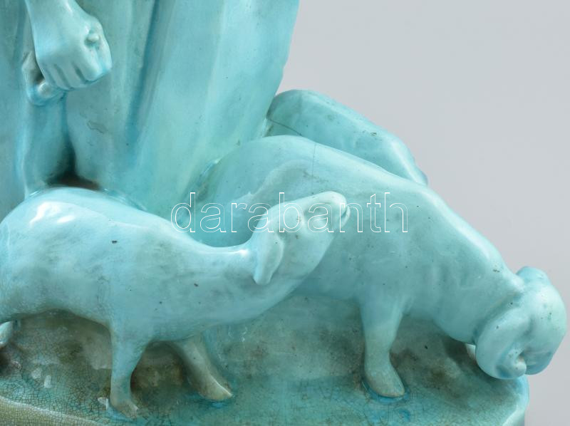 Leírás: Zsolnay kisplasztika: Nyáját terelő juhász. Formába öntött, alapmázas. Beszédes János László terve, 1921. Jelzett: masszába nyomott 8974-es formaszám, repedésekkel m: 36 cm