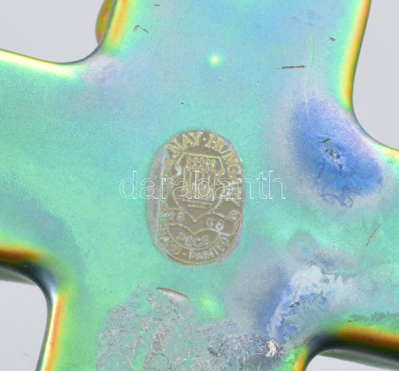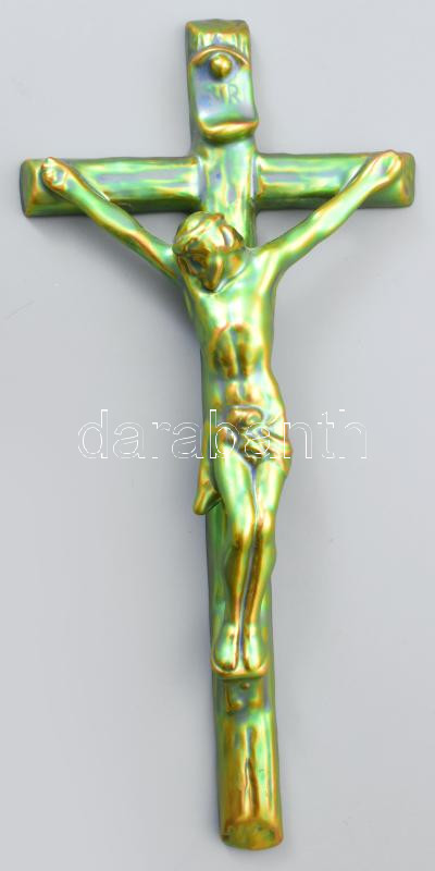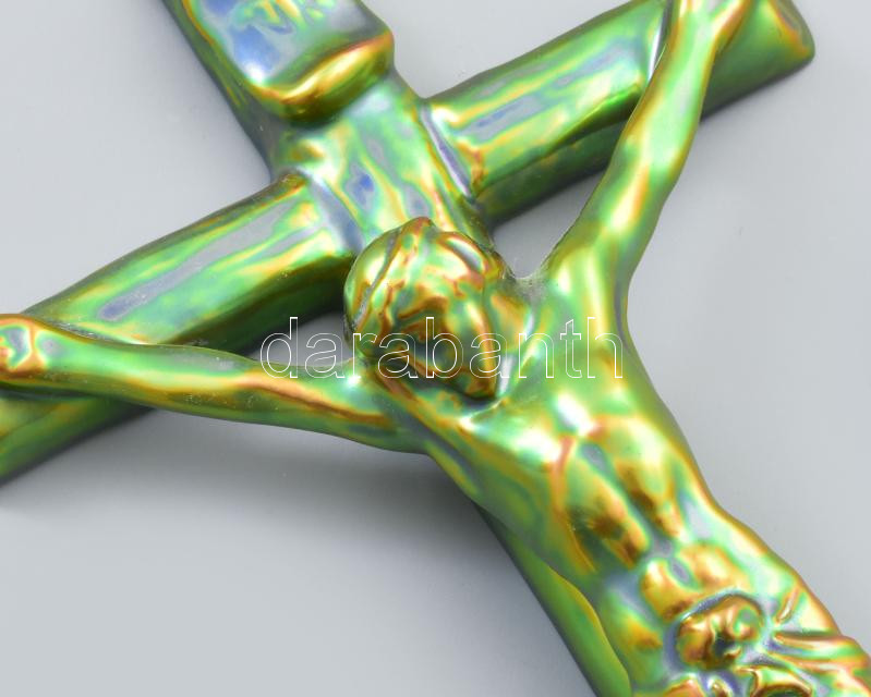 Leírás: Zsolnay kisplasztika - feszület. Öntött finomfajansz, többszínű eozin mázakkal festve. Jelzett, kis mázkarcokkal, 34x16,5 cm