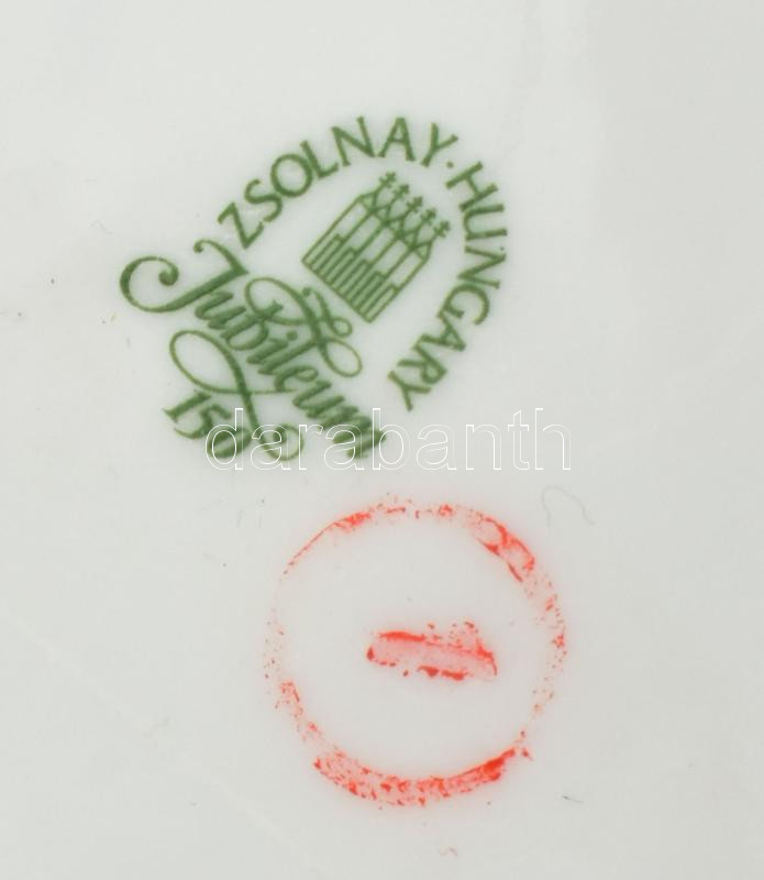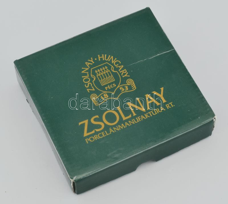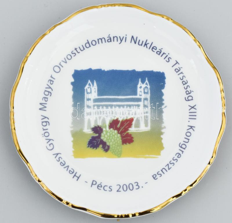 Leírás: Zsolnay tálka a "Hevesi György Magyar Orvostudományi Nukleáris Társaság XIII. Kongresszusa" alkalmára, jelzett, hibátlan, d: 12 cm, dobozában
