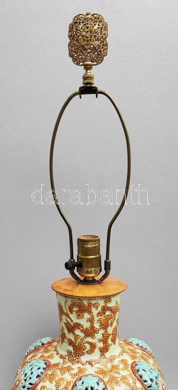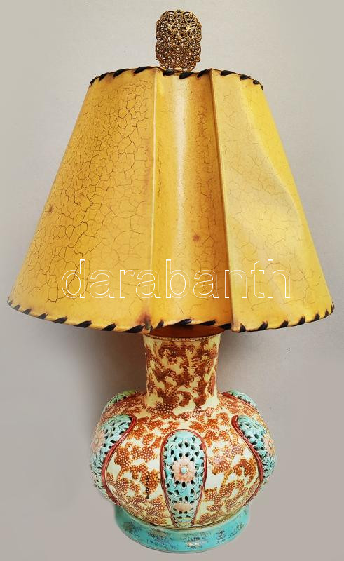 cca 1885 Nesselsdorfer Thonwarenfabrik Adolf Raschka, Moravia, Majolika lámpa. Az arab stílust követő dupla falú és domború díszítésű vázából kialakított lámpa, búrával, jelzett. Elektronika: Leviton (USA) Működőképes. A külső vezeték és kapcsoló nem eredeti. A korának megfelelő állapotban.