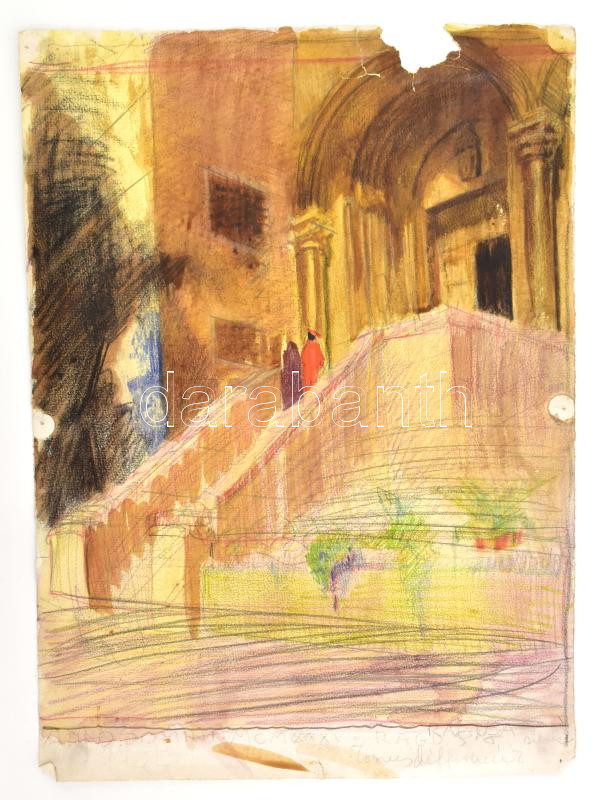 Galambos Margit (?-?), működött 1920-30 körül: Ragusa, 1925. Akvarell, ceruza, papír, jelzés nélkül, lap alján autográf felirattal, sérült, 33,55x24,5 cm.