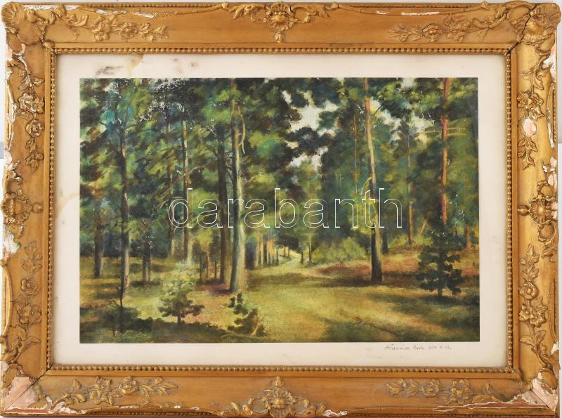 Leírás: Karádi Béla (?-): Erdőrészlet. Akvarell, papír. Üvegezett, sérült fakeretben. 28x42,5 cm