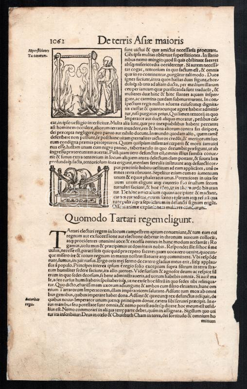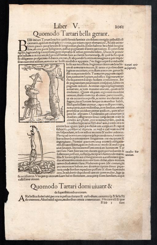 1560 Nyílpuskás férfi vadászik/akasztás, fametszetű illusztrációk, a másik oldalán további két fametszetű illusztrációval, papír, In: Sebastian Münster: Cosmographie, kissé foltos, az egyik szélén vágott, 33x20 cm